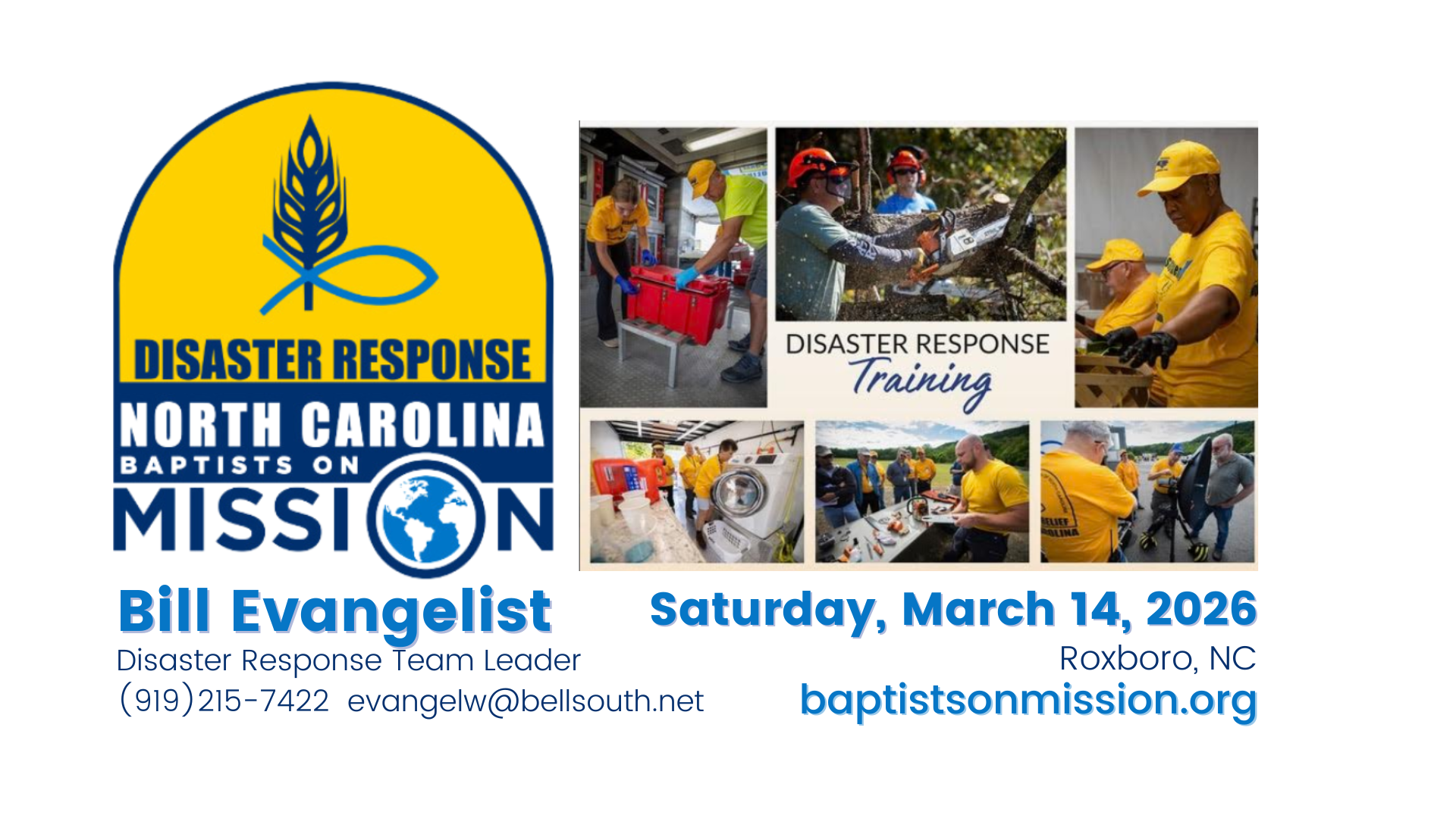 Join Baptists on Mission for Disaster Response Training and learn how to serve as the “hands and feet of Jesus” to those impacted by storms and disasters. This full-day training will be held on Saturday, March 14, 2026, from 8:30 AM to approximately 3:00 PM in Roxboro, NC (Region 4), with five other training locations across North Carolina on various dates throughout the year.