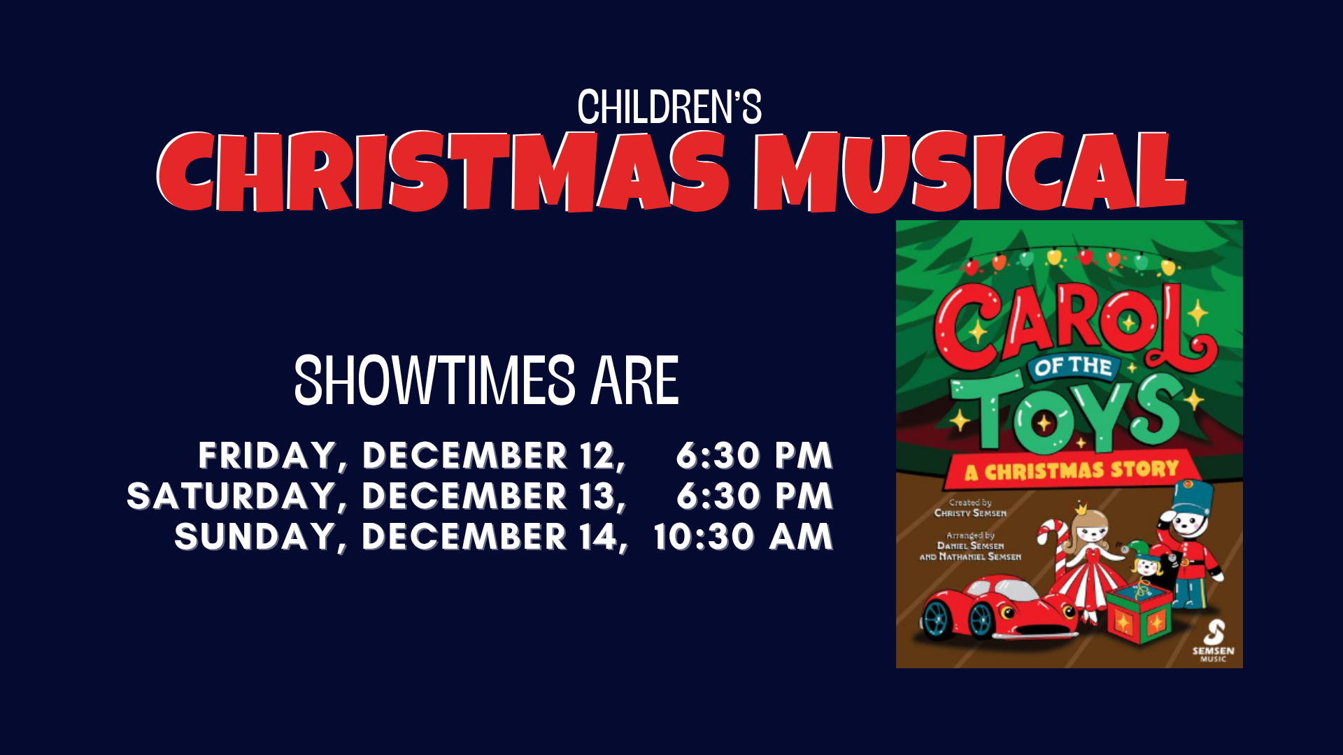 Set in whimsical Toyland, the story follows beloved toys preparing for their annual reunion with the Christmas toys—until they discover Mary, Joseph, and Baby Jesus are missing from the Christmas box! Toy Soldier leads a search party, and the journey unfolds with songs that share the Gospel through a candy cane, funky angel numbers, audience interaction, and the powerful closing song, “Christmas Prayer.”