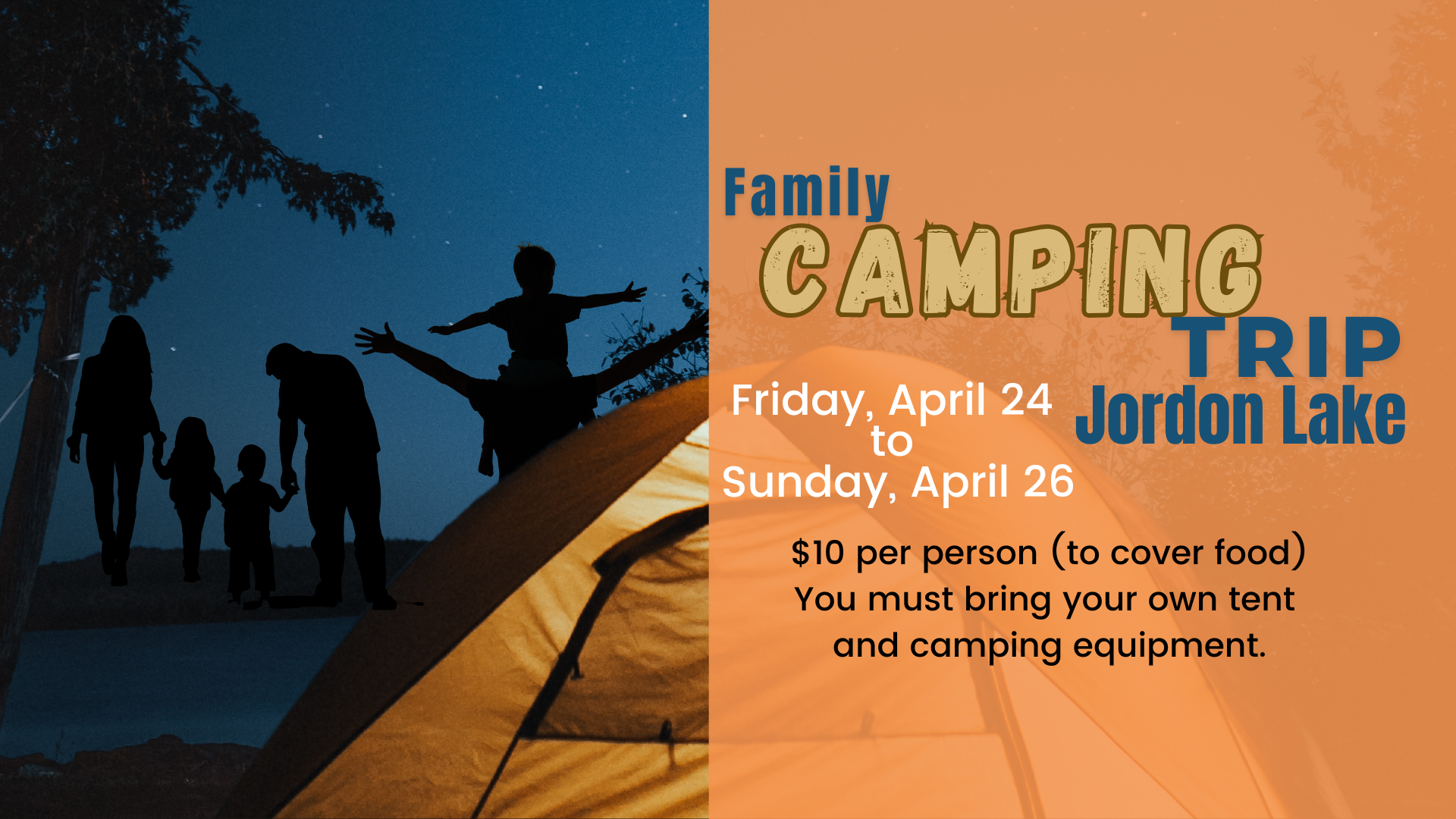 Mark your calendars for April 24–26 and plan to join us for a weekend of fun and fellowship at Jordan Lake! All ages are invited to be part of this special churchwide camping trip, a great opportunity to connect, relax, and grow together in a beautiful outdoor setting.