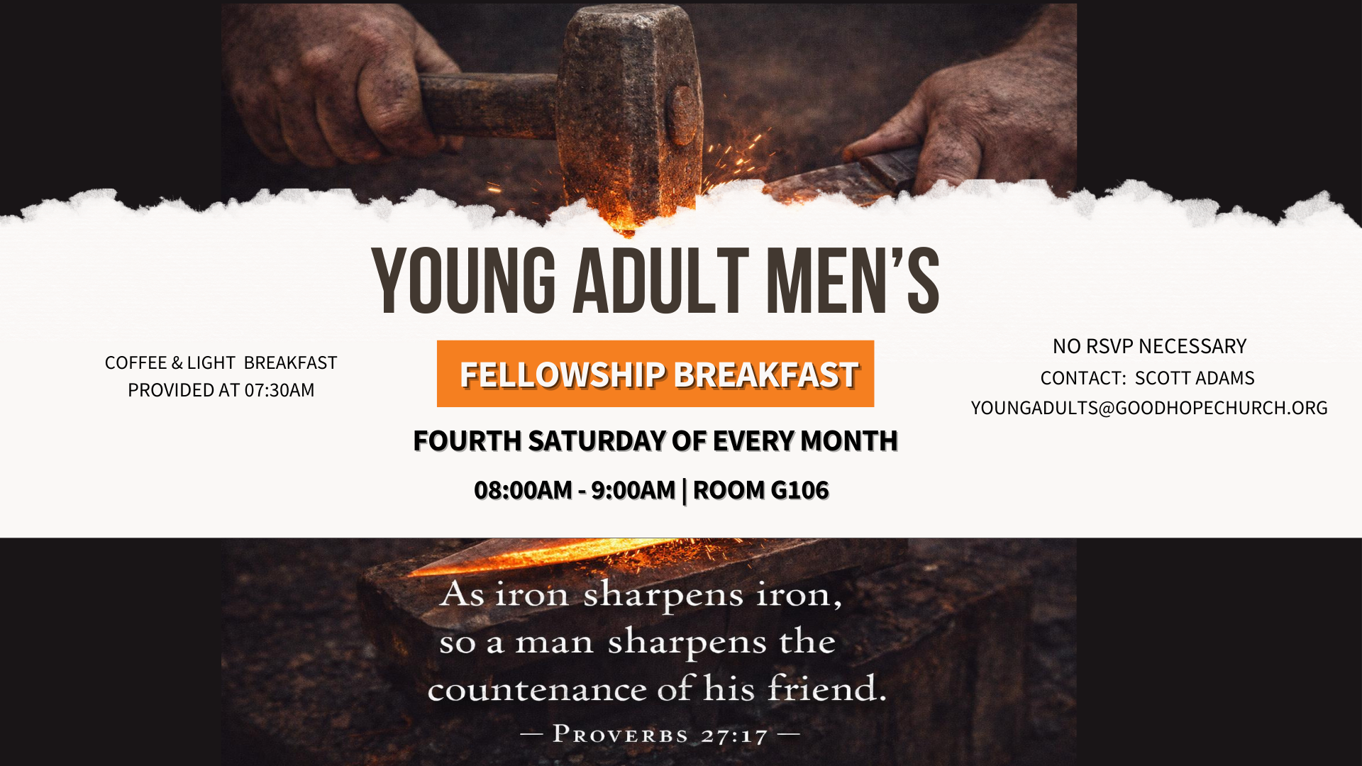 This time is set aside to connect, build meaningful relationships, and strengthen our faith together through open Bibles and honest conversation. Breakfast will be provided, and no RSVP is necessary—just come as you are. Contact Scott Adams: youngadults@goodhopechurch.org with any questions.