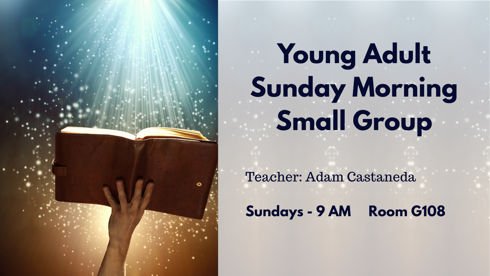 Young adults are invited to join our Young Adult Sunday Morning Small Group in room G 108 at 9 AM, led by Adam Castaneda